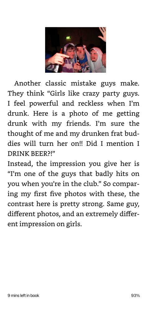 There’s some basic advice for taking photos – for example “Don’t Look at the Camera directly” the importance of fashion with some points that are really crucial and often overlooked by wingmen on the field – I spoke about this in my Tanner Guzy book review – fashion is really important and you need to make sure you are well dressed in all your Tinder photos as well as when you are cold approaching women- it’s really the bear minimum you can do. Your fashion can help to build a story of who you are in the woman’s mind – it can help create a fantasy in her head about what meeting and fucking you will be like. For me a lot of my flakes in my early game years from 2013-2015 were due to my subpar photos – I’d close women in nightclubs on Facebook then they’d see all sorts of shitty photos of me drinking strongbow at a house party and think “Why the fuck would I date this loser” and in fairness they were right – I presented myself as a loser with no hobbies or interests in my photos so why should I expect them to follow up if I had boring and dull photos that weren’t stimulating to them. Liam explains things well in this book and I honestly have said it time and time again good photos and fashion are a bear minimum for those starting out daygame or online game. It doesn’t take much or cost much to fix this issue but not fixing it can result in a lot of flakes and blow outs if you don’t. Liam recommends taking pics with a processional photography at least once or twice a year and I’d definitely agree with this. He also uses examples of bad photos and what not to use self critiquing his old Facebook photos.