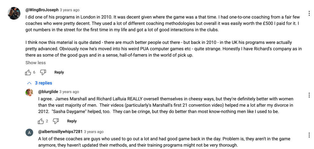 A lot of his other reviews complain about Richard’s absence on bootcamps in the prior link i posted under the Adam Lyons segment (who he collabed with a lot ) and his product reviews show a lot of complaints for excessive marketing and generic advice. When you look at what users feel from his actual purchases it appears that there are some obvious flaws in what Richard portrays- nevertheless he’s well spoken, well dressed , youthful looking despite being 41 and gets high praise in comments on his PUA speeches especially his ones for 21 convention- I remain to be unconvinced as to whether he’s the “real deal” based off the product and bootcamp reviews .